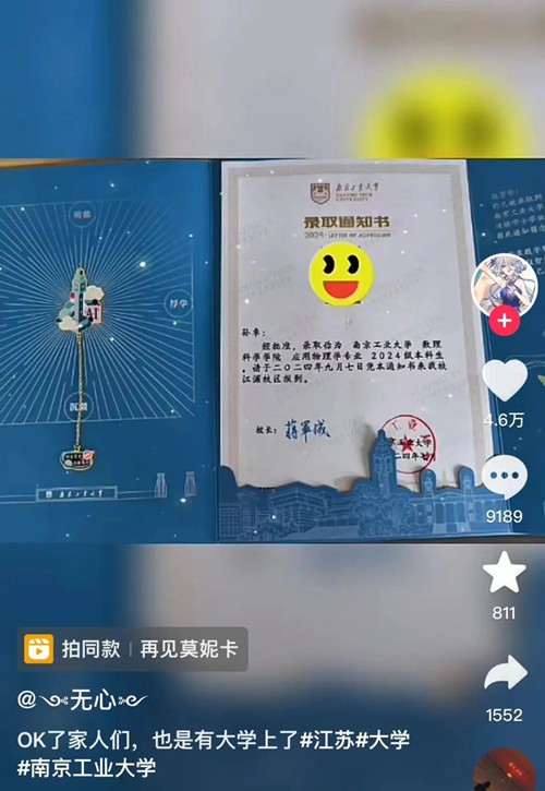 【孙卓被南京工业大学录取】7月25日,电影《亲爱的》的人物原型孙海洋的儿子孙卓通过个人社交账号发布视频称,“OK了家人们,也是有大学上了。”视频晒出的录取通知书显示,孙卓被南京工业大学数理科学学院应用物理学专业录取。