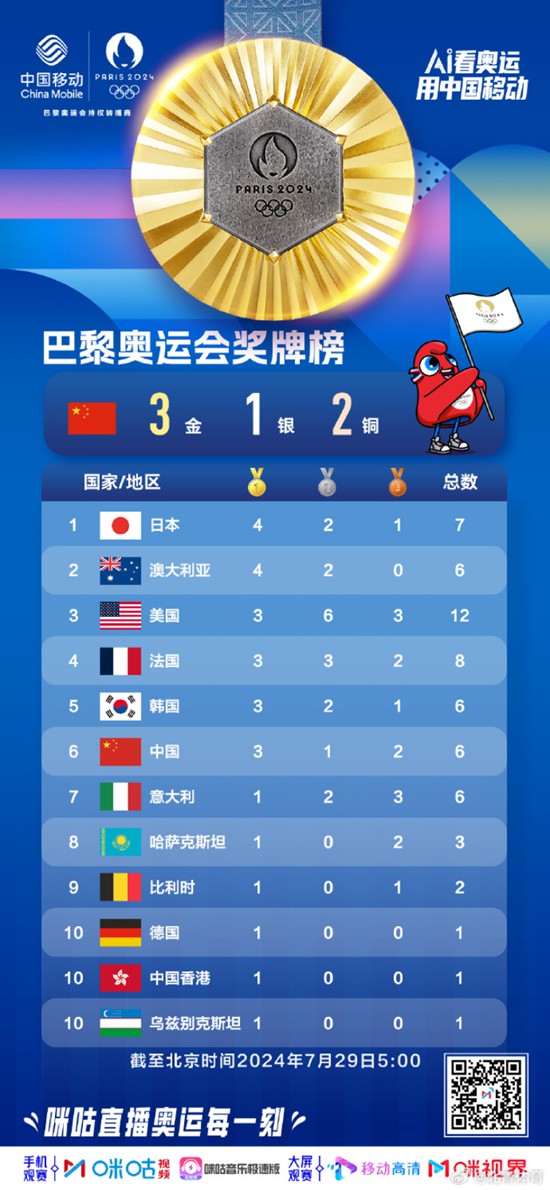 原标题:奥运第二日:奥运奖牌榜中国军团暂居第6 新增1金1银1铜