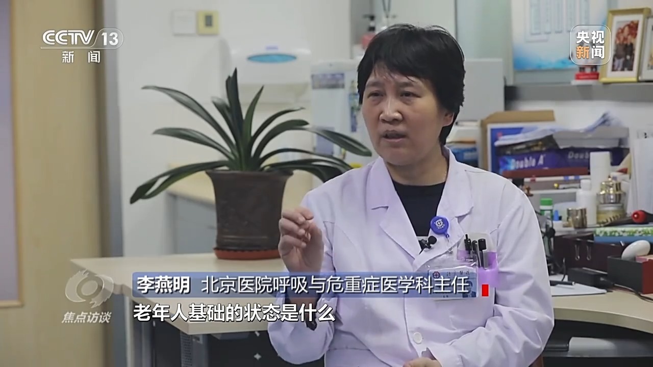 北京医院呼吸与危重症医学科主任 李燕明:对家里人来说,的确是比较困难的选择,需要结合老年人的年龄,基础疾病的严重程度和感染的严重程度来综合研判。首先要特别清楚的是老年人基础的状态是什么、基础体温是什么、基础的心率、基础的呼吸、基础的血压、基础的外周血氧饱和度是什么样的情况,因为出了问题要去比较的时候,要跟基线比较。第二点要根据老年人现在本身罹患的呼吸道感染的严重程度,基础疾病的严重程度和年龄进行综合考虑。