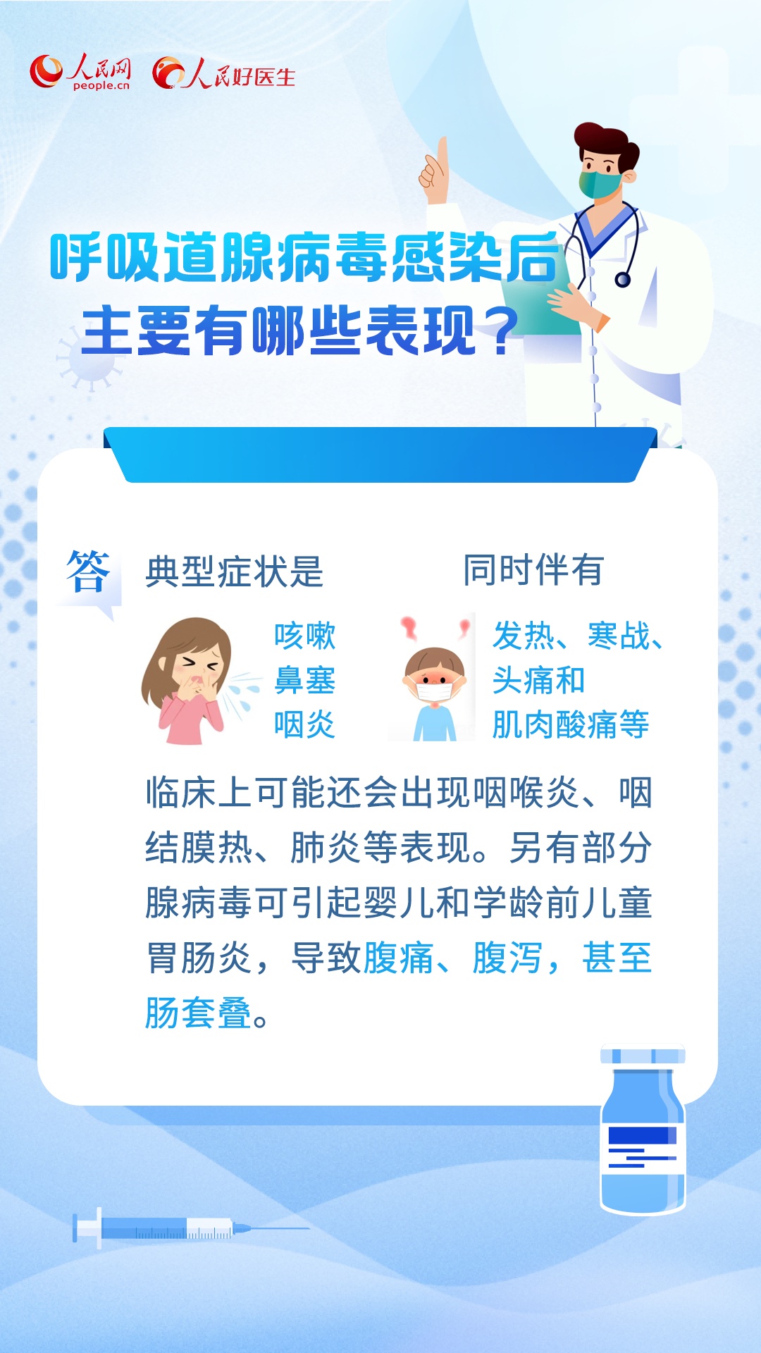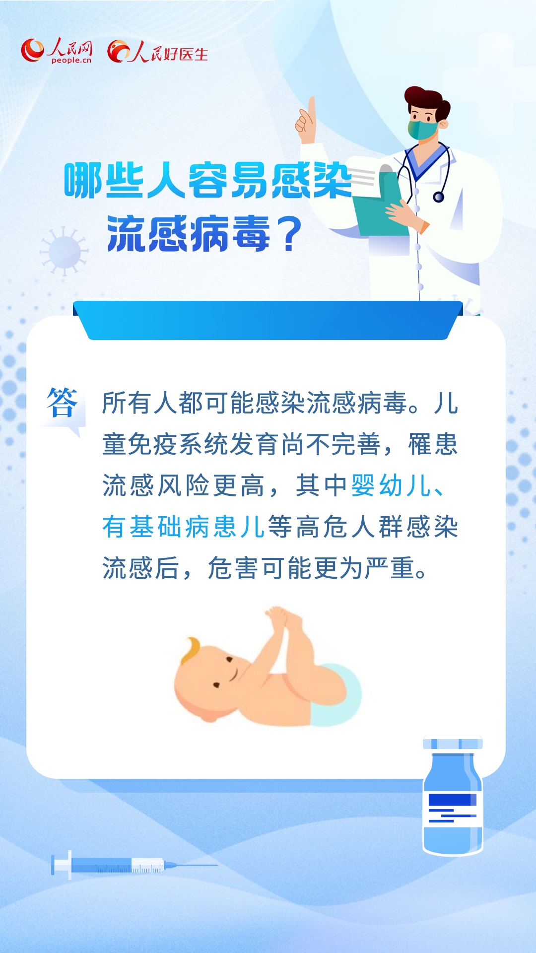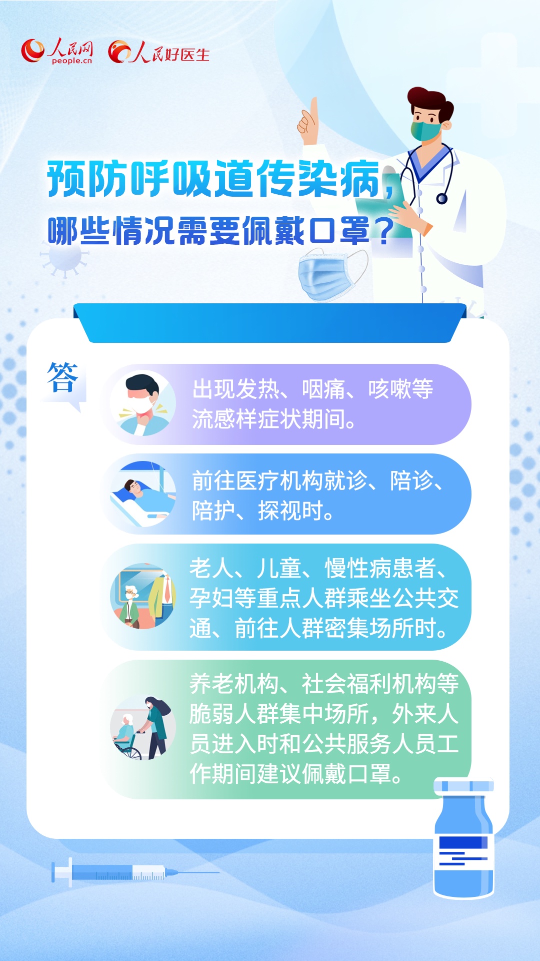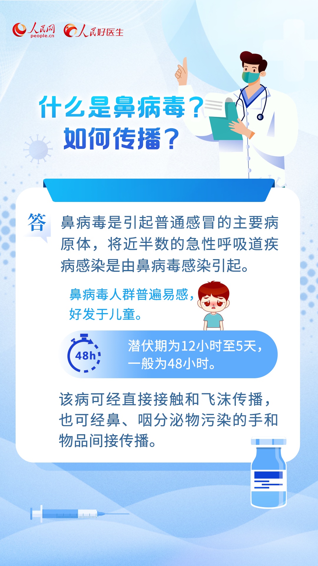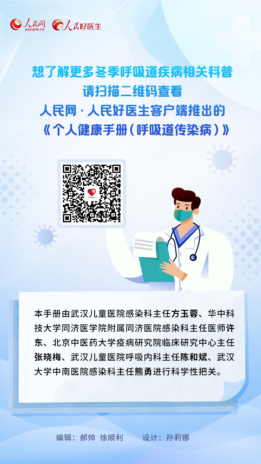 编者按:每年进入冬季,呼吸道疾病都是高发时期。近期,呼吸道感染性疾病以流感为主,此外还有鼻病毒、肺炎支原体、呼吸道合胞病毒、腺病毒等。为积极做好冬季呼吸道传染病科普工作,人民网·人民好医生客户端推出《个人健康手册(呼吸道传染病)》,集纳专家观点,科普相关知识,助力提高大众自我健康管理能力和健康素养。
