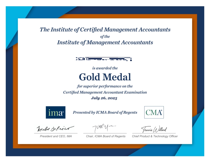 IMA管理会计师协会考试认证部日前公布了2025年7月举行的CMA注册管理会计师认证中文考试高分获奖者名单。