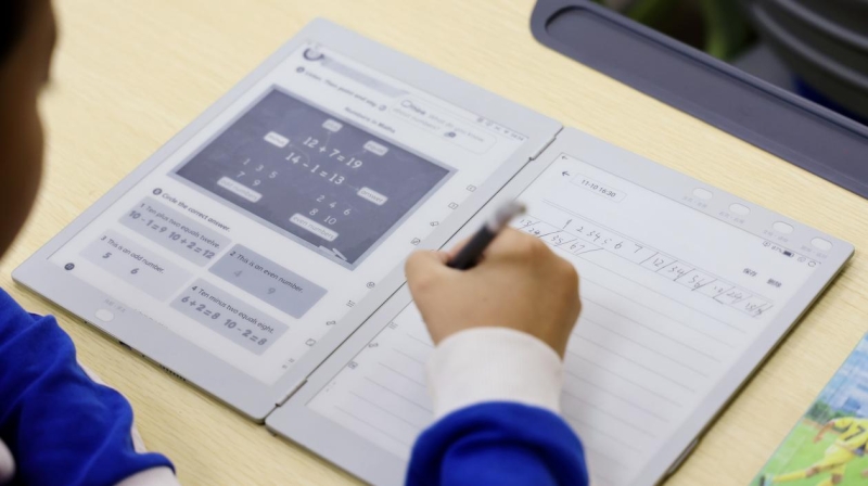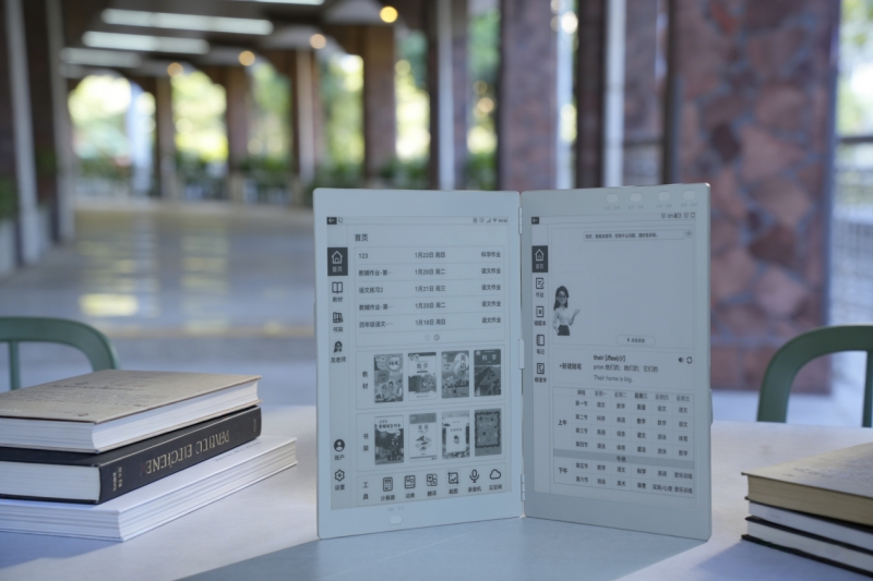 在深圳市龙岗区科创实验学校(集团)平安里学校内,4-6年级的语文、数学、英语课堂场景正在悄然发生改变。书桌上的课本和笔记本变成了双屏墨水屏新“书本”,学生们在左屏看课本、习题,在右屏同步记笔记、做作业。随堂练习时,老师通过新“书本”,即可发放习题试卷同步到学生们的设备,在学生提交答案后,更可快速完成智能批改……在课堂的多个教学环节中,新“书本”正带来不同以往的新体验。