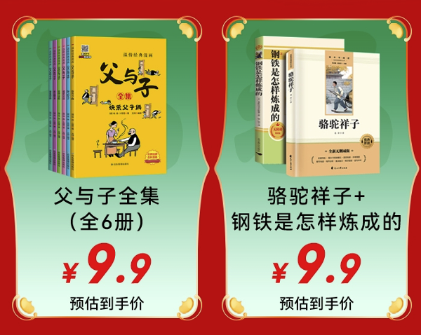 如果想让孩子在寒假闲暇时品读经典名著,感受经典作品跨时空的魅力,这几本好书值得关注。漫画大师埃·奥·卜劳恩的《父与子全集》全6册,以幽默温情的笔触描绘父子日常,让孩子从中获得开怀的幽默,感受到诚挚的亲情,活动预估到手价9.9元。《骆驼祥子》和《钢铁是怎样炼成的》作为人教版教材配套阅读书目,兼具文学审美与思想价值,以不同的人生叙事传递深刻的思想启迪,让孩子在阅读中体会到生活的厚重与命运的多样,汲取直面困境、坚守内心力量的精神养分,预估到手价9.9元。