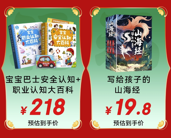 在品读经典名著之外,为孩子挑选优质的启蒙读物,也是新春囤书的重要选择。《宝宝巴士安全认知大百科》和《宝宝巴士职业认知大百科》两本书通过生动画面与互动设计,帮助孩子在趣味中建立安全意识、认识多彩职业,是低龄儿童认知启蒙的实用读物,组合预估到手价218元。《写给孩子的山海经》将原本晦涩难懂上古奇幻巨著,转化为易读易懂的图文内容,让孩子在巨大的想象空间中肆意遨游,引发了解中国历史、地理和神话的兴趣,预估到手价19.8元。