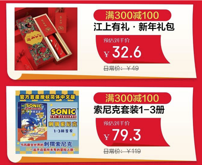 适配新年礼赠的文创好物与童趣陪伴的少儿图书备受青睐,两款好物均享满300减100优惠,精准覆盖家庭礼赠与亲子陪伴需求。《江上有礼》新年礼包汇集多位书法名家的经典笔墨,无论是新年装饰还是拜年礼赠都尽显格调,预估到手价32.6元。《索尼克套装》1-3册讲述刺猬索尼克守护世界的热血冒险故事,精彩的故事内容陪伴孩子度过欢乐的新年时光,是亲子共读、童趣陪伴的优质选择,预估到手价79.3元。
