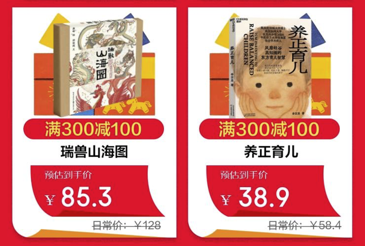 具备文化底蕴的国风文创图书与实用的科学育儿书籍,精准适配家庭文化熏陶与育儿需求,两款图书均享满300减100优惠。《瑞兽山海图》以工笔重彩技法精心绘制四十余幅传统瑞兽形象,搭配详实的文字解读,让读者深入了解传统瑞兽文化,兼具传统文化科普和收藏欣赏价值,预估到手价85.3元。《养正育儿》融合中医养生理念与科学育儿逻辑,直击现代家庭的育儿痛点,给出具体的养身、养心方案,帮助父母告别育儿焦虑,用科学的方式守护孩子身心健康成长,活动预估38.9元可入手。