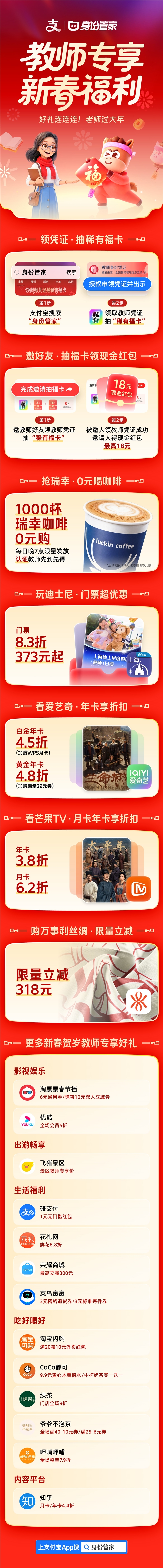 2026年农历新春前夕,支付宝“身份管家”平台联合众多商业品牌,在集福活动中践行“尊师惠师”公益理念,通过数字化方式为全国教师提供专属的新春福利,探索社会力量参与尊师重教的新路径。
