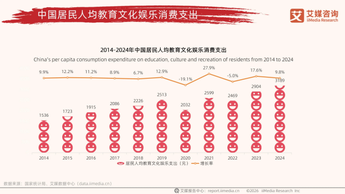 随着收入水平提升和社会发展理念转变,国民正将更多资源配置于精神文化领域与个人能力发展。数据显示,2024年中国居民人均教育文化娱乐消费支出达3189元,同比增长9.8%。