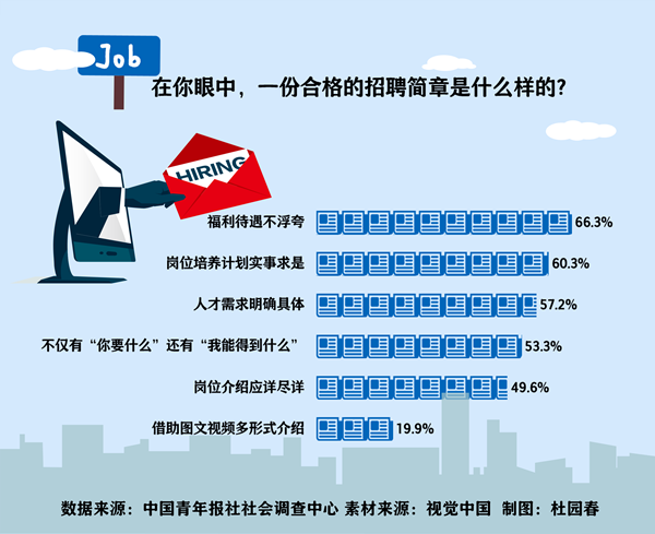 日前,中国青年报社社会调查中心联合问卷网(wenjuan.com),对1334名应届大学生进行的一项调查显示,在他们眼中,一份合格的招聘简章,首先是福利待遇不浮夸(66.3%),其次是岗位培养计划实事求是(60.3%),再次是人才需求明确具体(57.2%)。