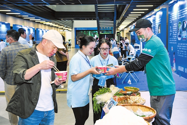 11月21日,在陵水酸粉师傅展位上,市民游客现场品尝地道的陵水酸粉。