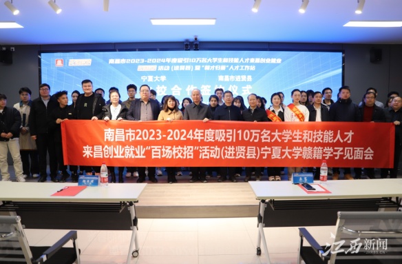 在位于银川的宁夏大学,进贤县2023年秋季“百场校招”共建“赣才归巢”人才工作站建站签约揭牌及学子见面会在政校双方领导和80名赣籍学子一同见证下隆重举行。活动现场,该县有关工作人员就人才工作站合作愿景、建站内容、召开学子见面会,详细介绍进贤县情,解读南昌市人才新政。据进贤县人社局局长曾保斌介绍,本轮省外高校线下“百场校招”活动分别走进宁夏大学、北方民族大学,共组织了洪达医疗、李渡酒业、江联重工、隆莱生物、大北农等10家企业,提供生物医药、农副产品、商超食品等就业岗位325个,求职人员1300余人,收取简历382份,初步达成就业意向81人。