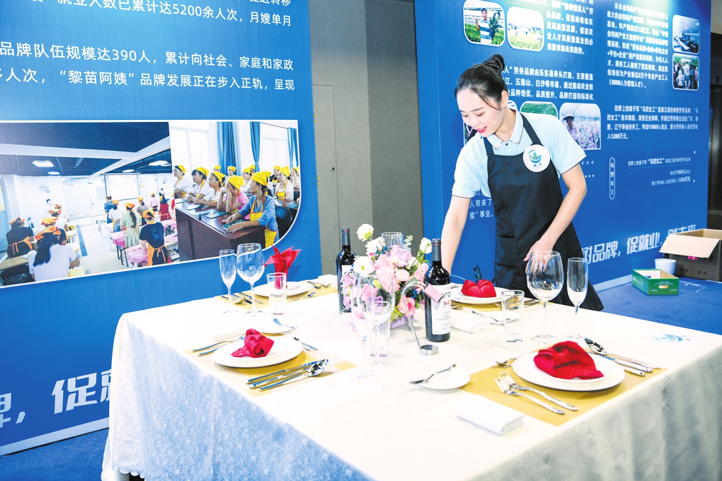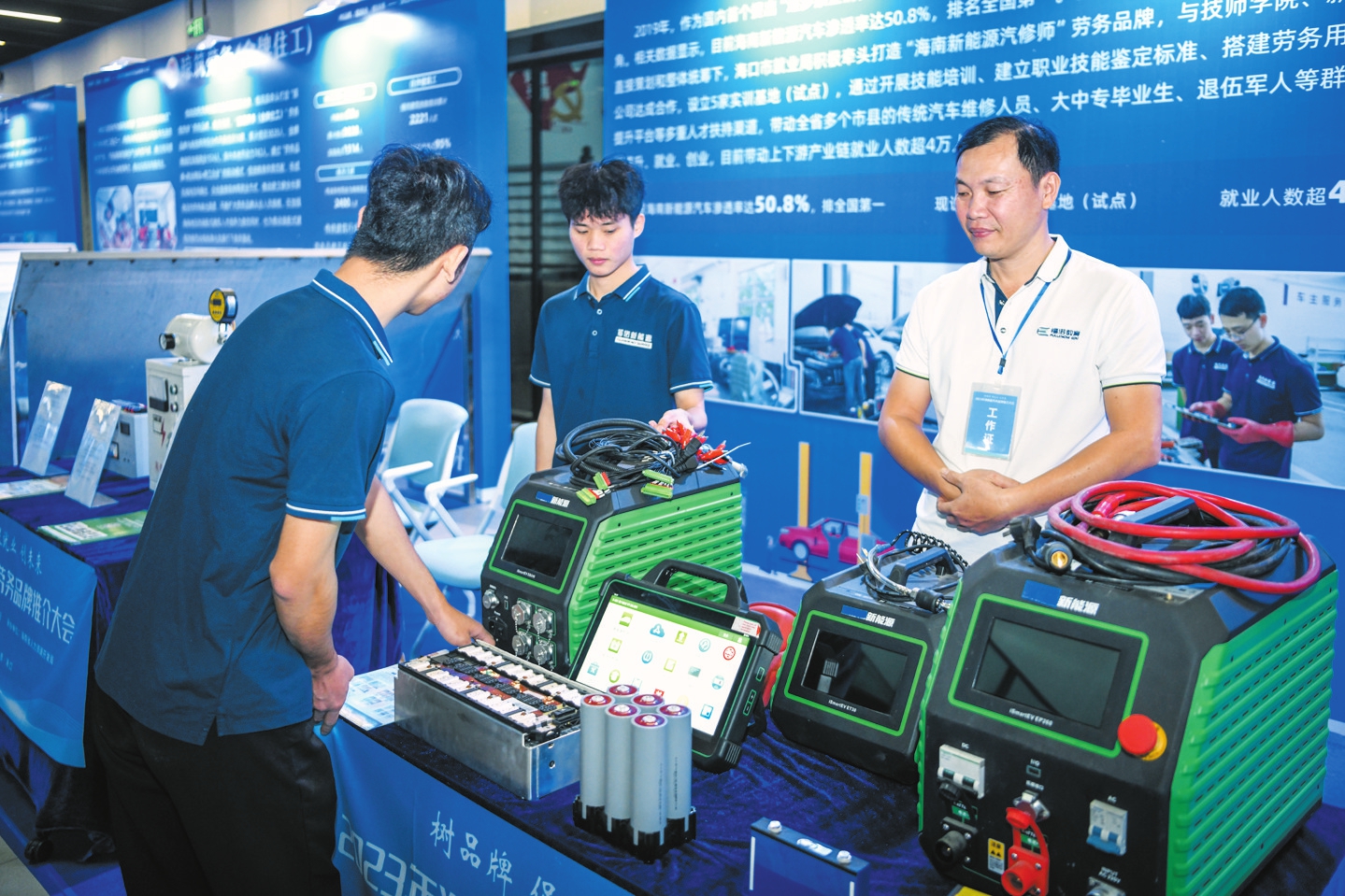 将餐巾折叠整齐放在盘子中央,餐具从左到右依次排开,两只高脚杯放在餐垫右侧……11月21日,2023年海南省劳务品牌推介大会在海口举办,来自全省的多个优质劳务品牌集中亮相,现场展示技能、推介品牌。其中,由海口牵头、多个市县共同打造的“椰嫂”“海南新能源汽修师”等劳务品牌吸引了众多目光。