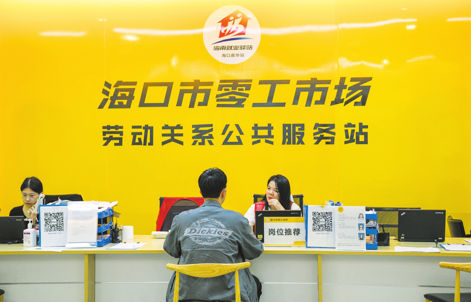 11月20日,在海南就业驿站海口嘉华站(海口市零工市场),工作人员为求职市民解答相关问题。
