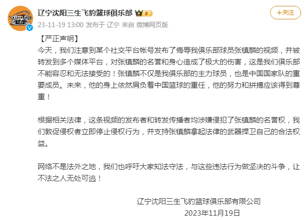 辽宁沈阳三生飞豹篮球俱乐部官方微博发布严正声明: