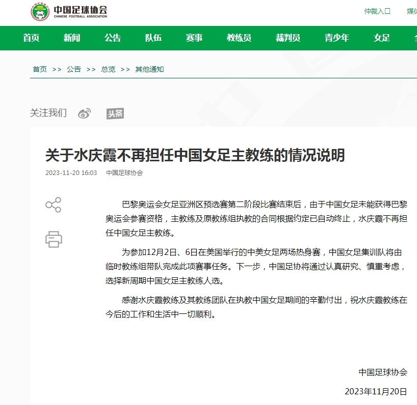 中国足协在官网的公告中写道:“巴黎奥运会女足亚洲区预选赛第二阶段比赛结束后,由于中国女足未能获得巴黎奥运会参赛资格,主教练及原教练组执教的合同根据约定已自动终止,水庆霞不再担任中国女足主教练。”