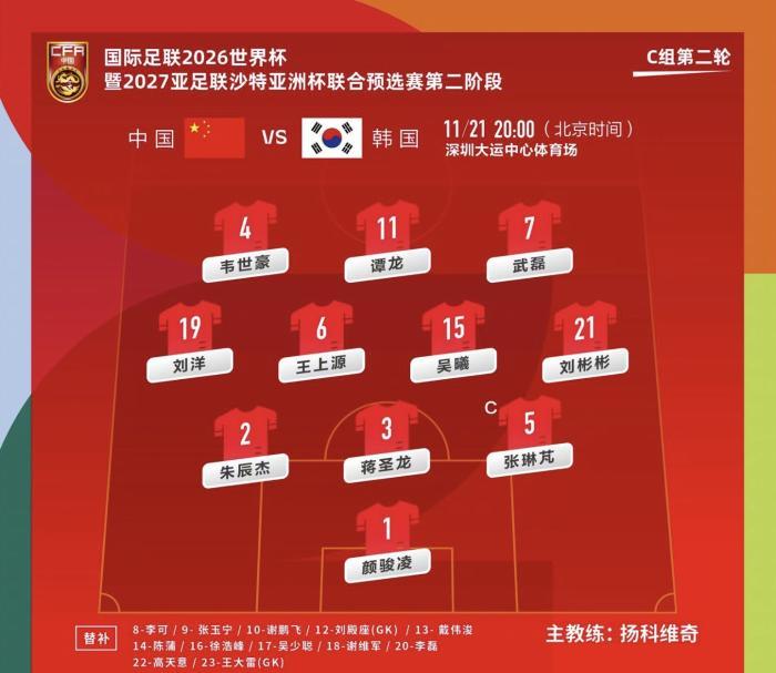 本场比赛,国足对首发阵容作出两处调整:左翼卫刘洋顶替李磊首发,而上一场进球的王上源顶替李可出场。