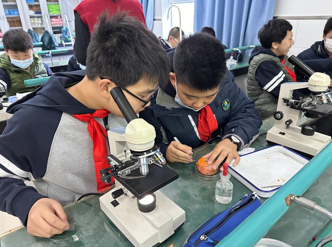 “大家可以慢慢撕开柿子皮,把果肉倒进滤网里过滤,再挑出它的种子,也就是我们常说的‘小舌头’,裹上面包糠……”八十中实验楼的一间教室里,在生物教师冯银平的指导下,初一10班的20名学生两人一组,现场制作柿子果丹皮和果脯。隔壁教室里,另一拨学生结合正在学习的《生物体的结构》知识,动手制作玻片,通过显微镜观察柿子果皮、果肉等组织。
